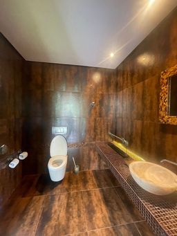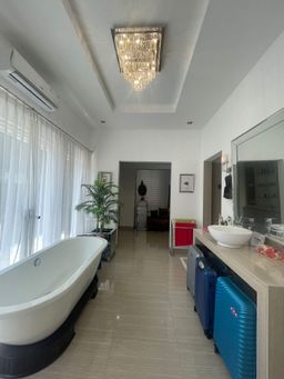 Direkt angrenzend ist das Badezimmer mit Badewanne, Dusche und Ankleidebereich, außerdem gibt es vom Badezimmer Zugang zum Spabereich, wo man sich massieren lassen kann.