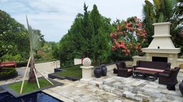 In ruhiger Lage, verteilt auf großer Fläche mit vielen Sitzmöglichkeiten, 3 Ebenen, kleinem Fischteich, großer Terrasse und großer Grillbereich, 2 Sonnenliegen, ein Gazebo zum Entspannen, riesiger Wohnbereich mit 75 Zoll TV, extra Sicherheitshäuschen, kleiner Dschungel zum Erkunden (falls man will), Bar mit Barhockern, abgetrennte Küche mit allem, was man braucht, usw.